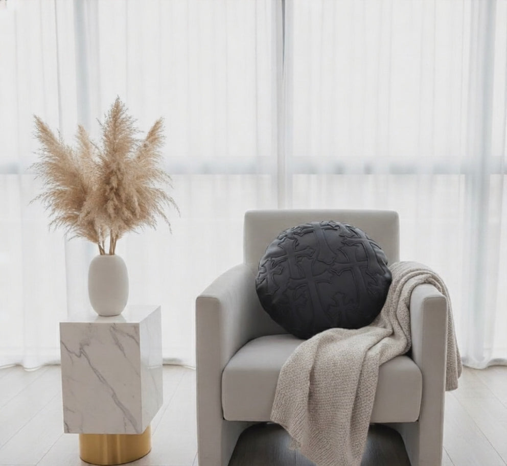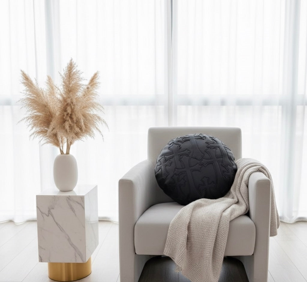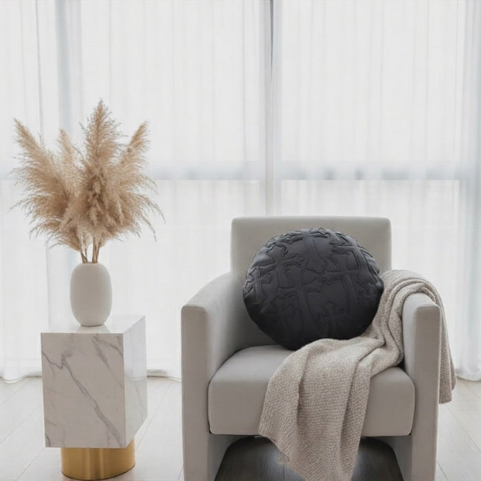 This CH cross embroidery round leather pillow draws inspiration from the Chrome Hearts brand, showcasing a sleek and stylish design. Made with high-quality leather, it offers a unique touch of luxury to any living space. With a chic and timeless design, this pillow is the perfect addition to elevate your home decor.
